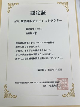 * Chứng chỉ ASK (viết tắt của Alcohol Safety Key Trainer – Chuyên gia Đào tạo An toàn Rượu bia) là một chứng nhận chuyên môn tại Nhật Bản, cấp cho các giảng viên chuyên đào tạo về an toàn khi sử dụng rượu bia và phòng chống hành vi lái xe sau khi uống rượu bia.